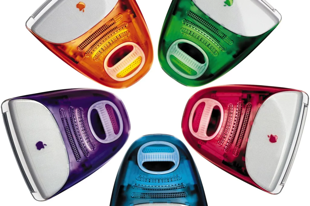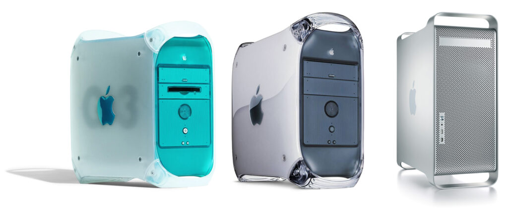 La gamme Mac adopte ce même esprit audacieux : le Power Mac G3 (1999) se pare de bleu et blanc, tandis que le G4, plus professionnel, mise sur le graphite et le blanc perle. L’iBook, portable inspiré de l’iMac, et l’eMac, version éducative puis grand public, complètent cette lignée colorée.